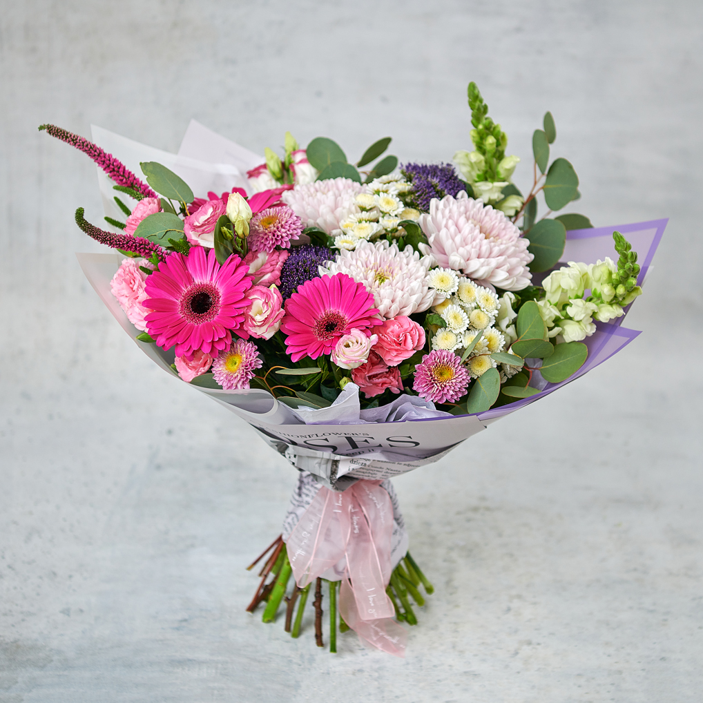 Эффектное сочетание в пышной упаковке, будет радовать взгляд долгое время благодаря стойкому составу, а цветовая палитра влюбит с первого взгляда. Возможны небольшие изменения элементов. Общий вид и композиция букета будет сохранена.