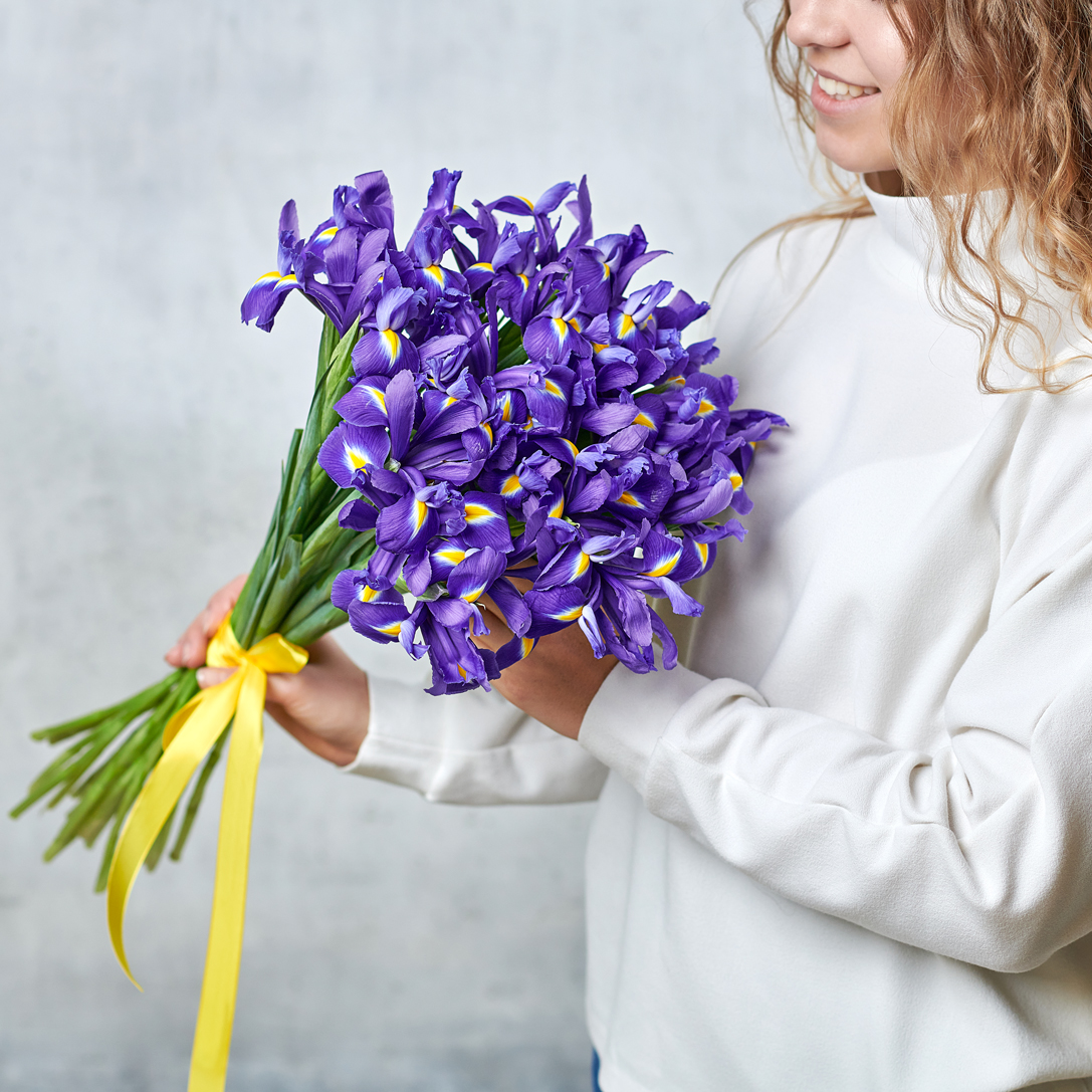 Ирисы - уникальный благородный цветок, ассоциирующийся с весной, творчеством и трогательными признаниями. Возможны небольшие изменения элементов. Общий вид и композиция букета будет сохранена.