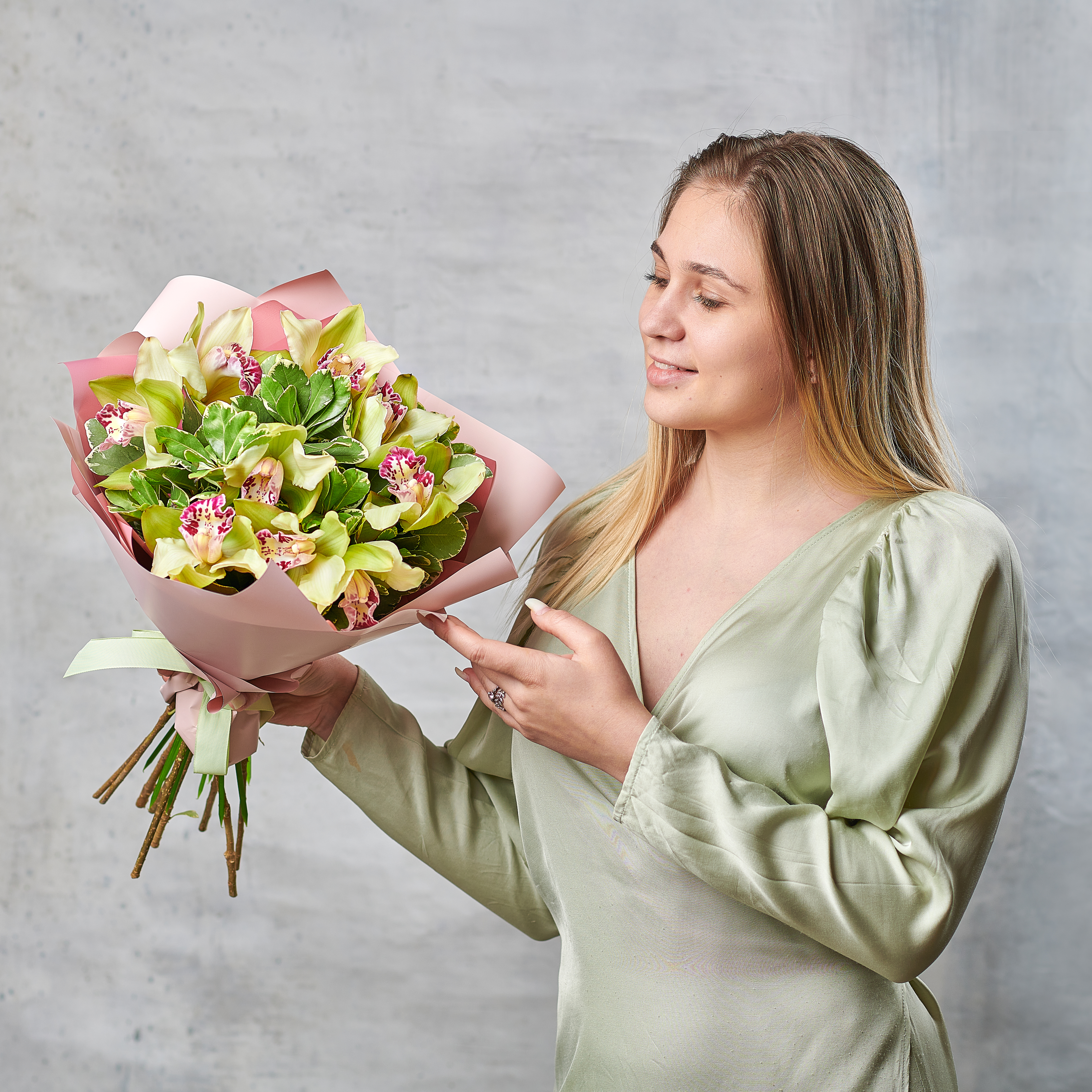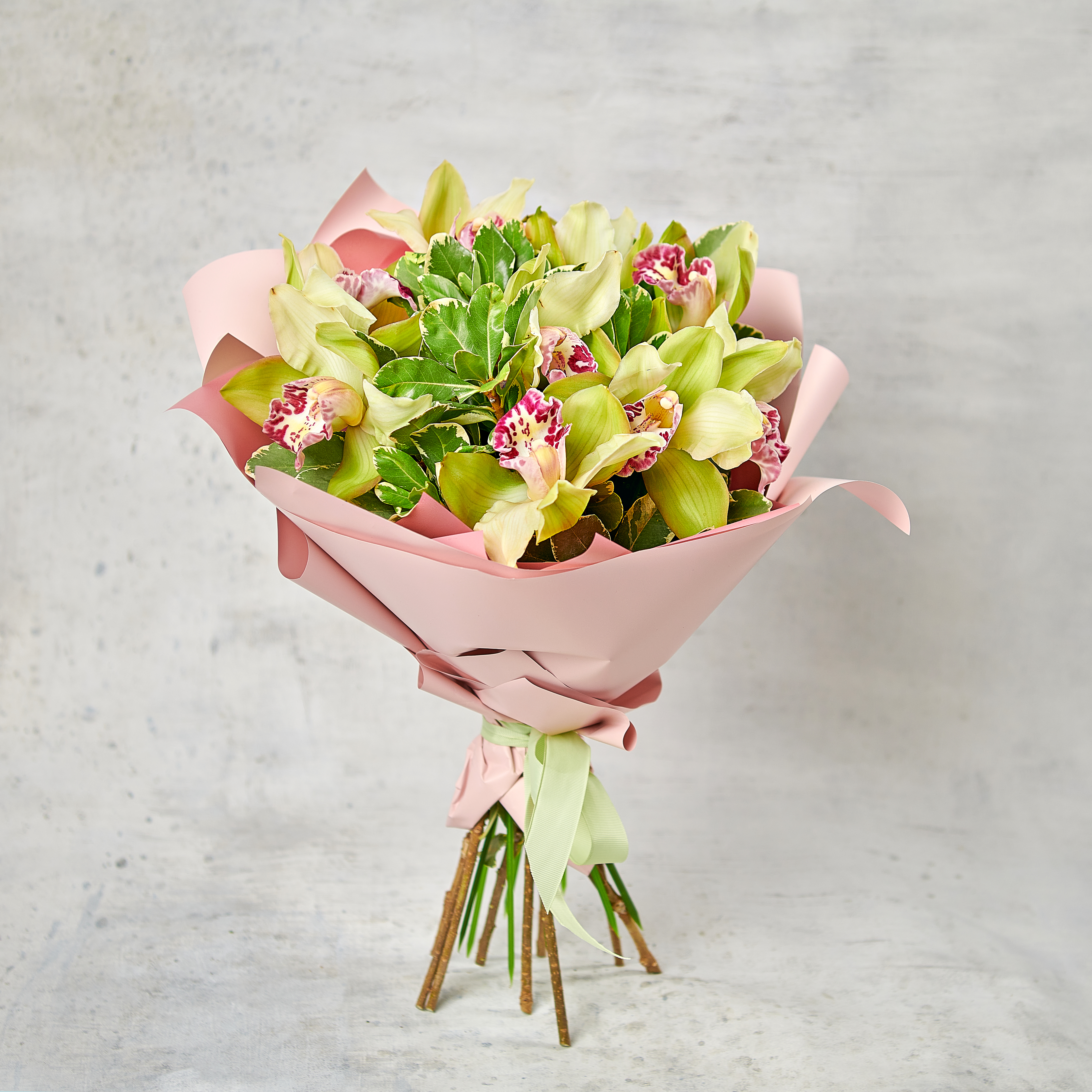 Тропические цветы любви и совершенства, орхидеи, окутанные свежей зеленью. Необычный и невероятно стойкий подарок с тонким загадочным ароматом - удивительный букет для настоящих эстетов. Возможны небольшие изменения элементов. Общий вид и композиция букета будет сохранена.