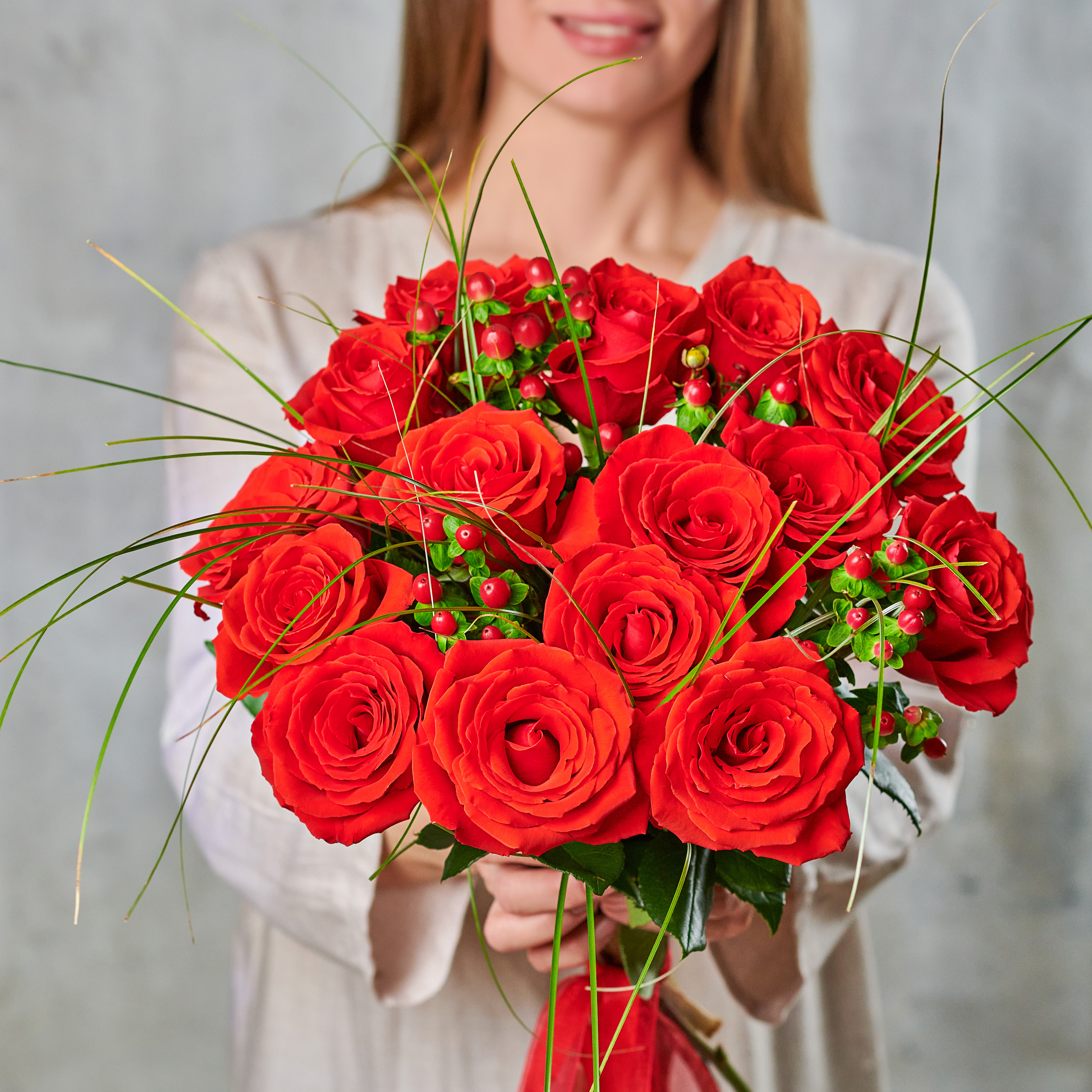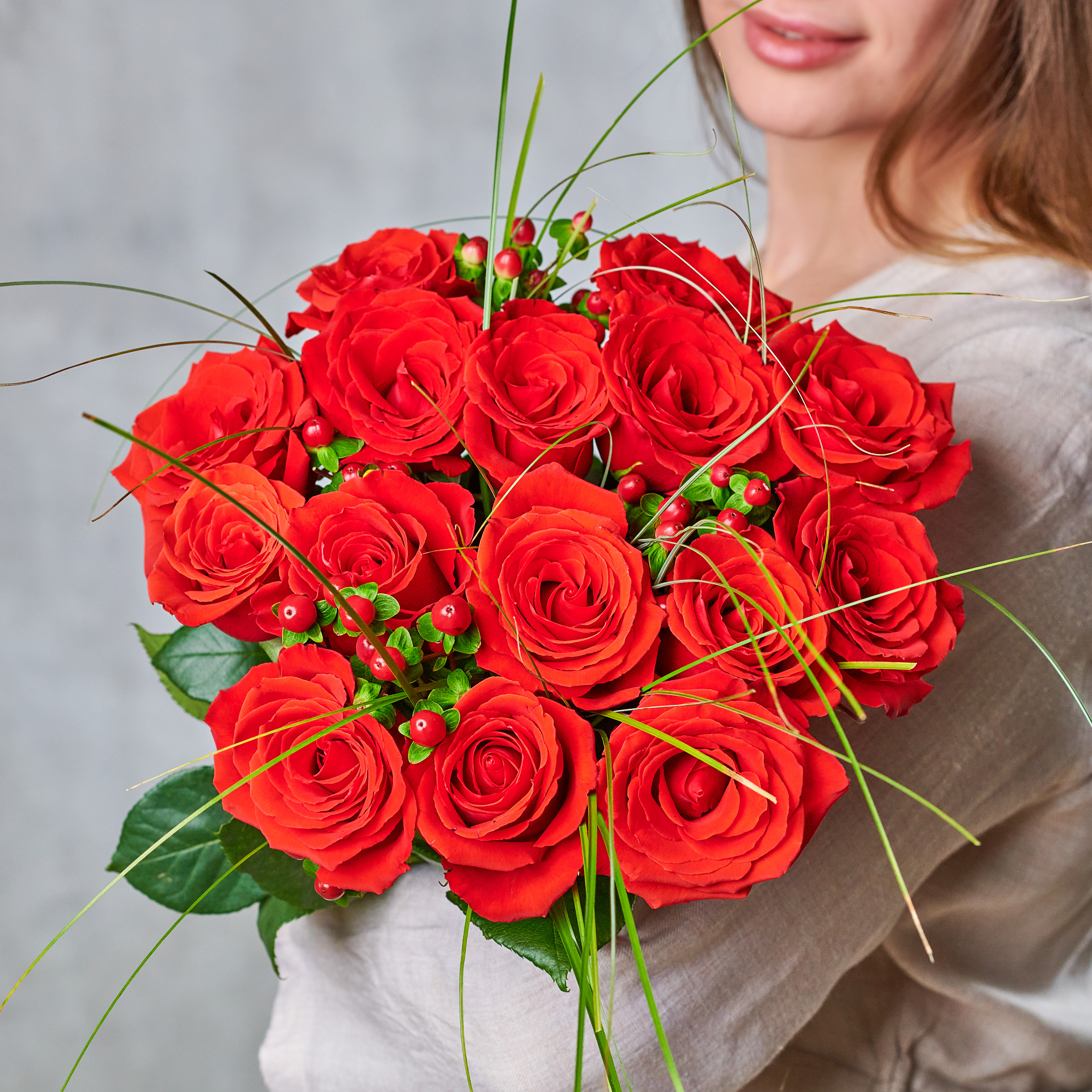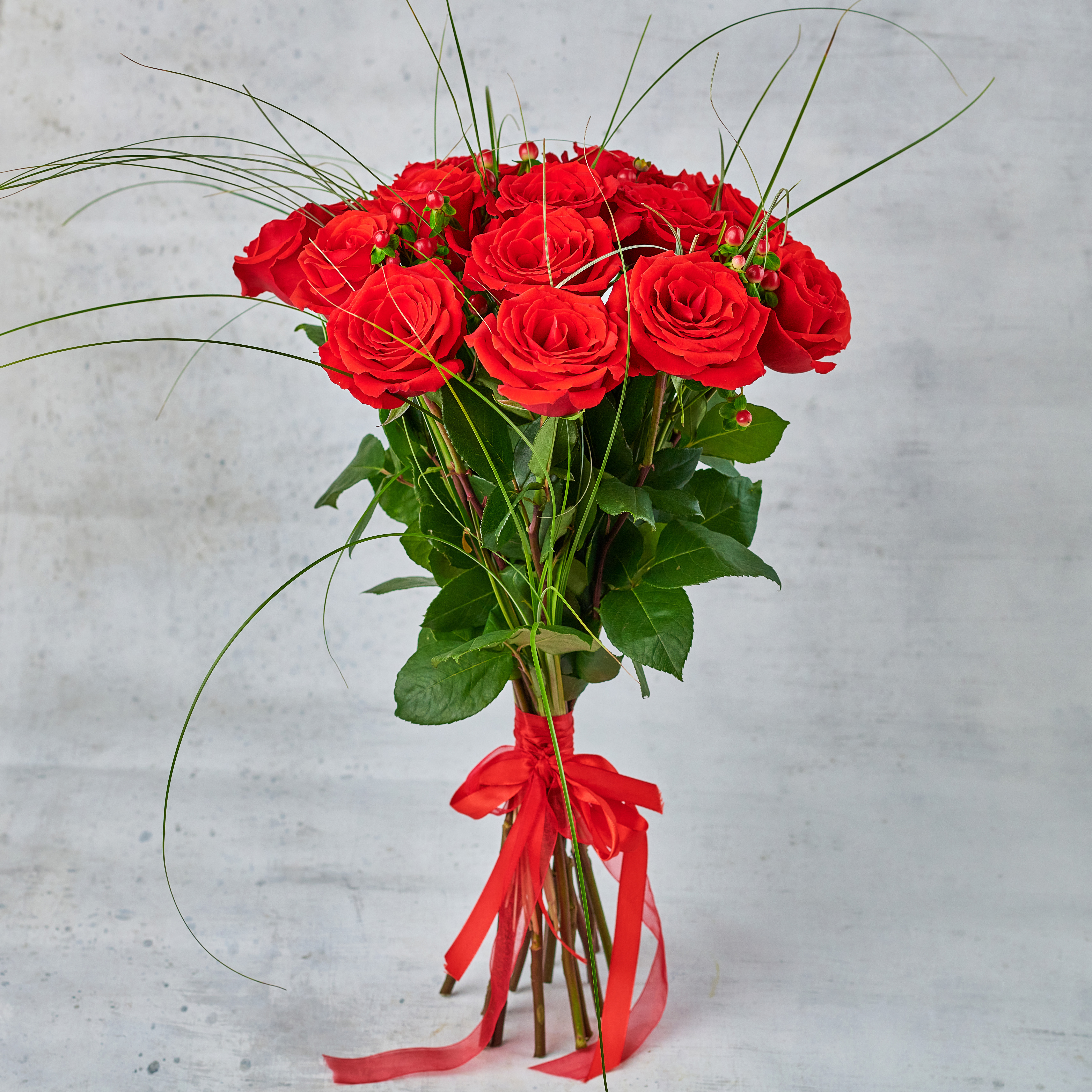 Букет из 15 роз с изящной зеленью - классический вариант для эффектных подарков. Возможны небольшие изменения элементов. Общий вид и композиция букета будет сохранена.
