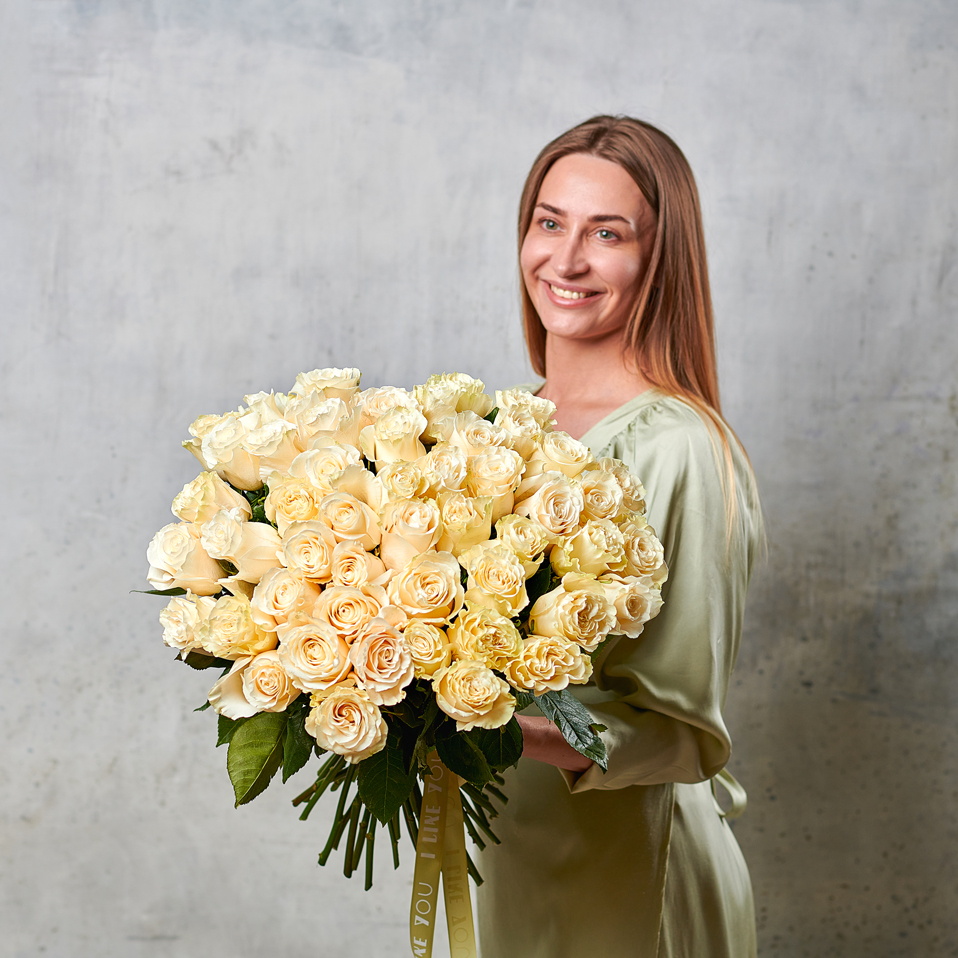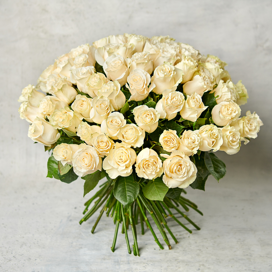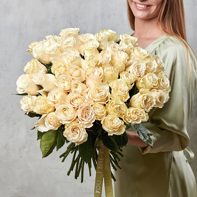 Символичный и очень знаковый букет из 51 белой розы - подарок, достойный королевских особ. Белые розы символизируют чистоту, искренность и нежность. Белые цветы дарят в знак преданности, любви и крепких чувств. Возможны небольшие изменения элементов. Общий вид и композиция букета будет сохранена.