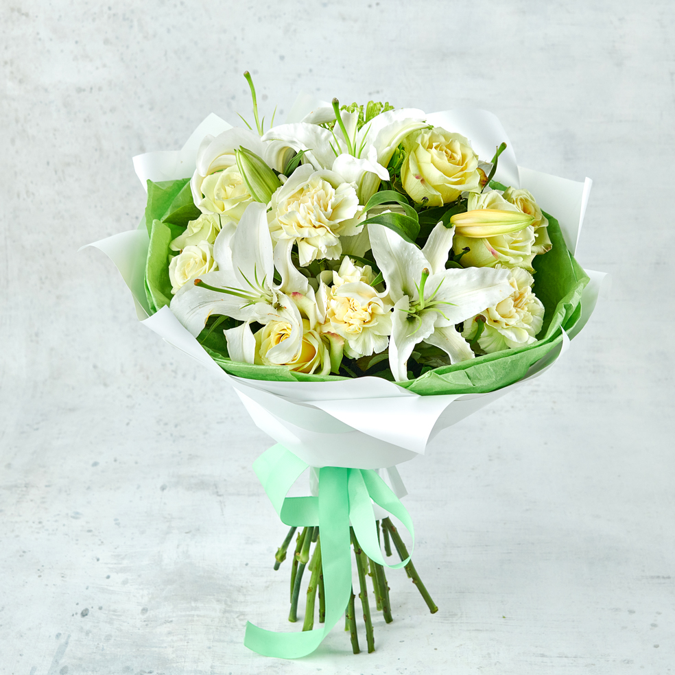 Бутоны белоснежной лилии, сливочные розы подчеркнуты фисташковой упаковкой. Для ценителей тайных посланий: лилия и белая роза символизируют нежность и чистоту чувств, а зеленый передаст гармонию и равновесие. Подойдет для воздушны и тонко чувствующих натур. Возможны небольшие изменения элементов. Общий вид и композиция букета будет сохранена.