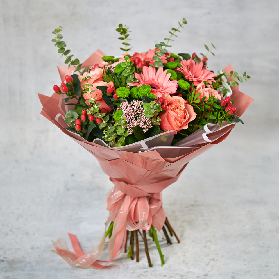 Богатый коралловый оттенок, персиковые детали и хрустящая зелень - роскошь на языке цветов. Букет в классическом стиле - это когда каждый цветок пышет текстурой, цветом и элитарностью. Классическое исполнение прекрасно впишется в тематику любого праздника и приведет в настоящий восторг каждую получательницу. Возможны небольшие изменения элементов. Общий вид и композиция букета будет сохранена.