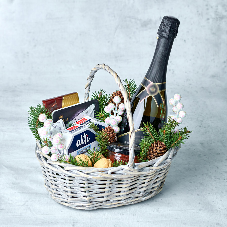 Удивляйте и восхищайте. Вкусная корзина точно поднимет настроение и погрузит в волшебную зимнюю сказку на опушке елового леса. Возможны небольшие изменения элементов. Общий вид и композиция букета будет сохранена.