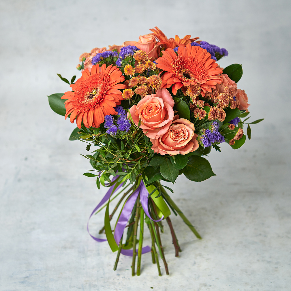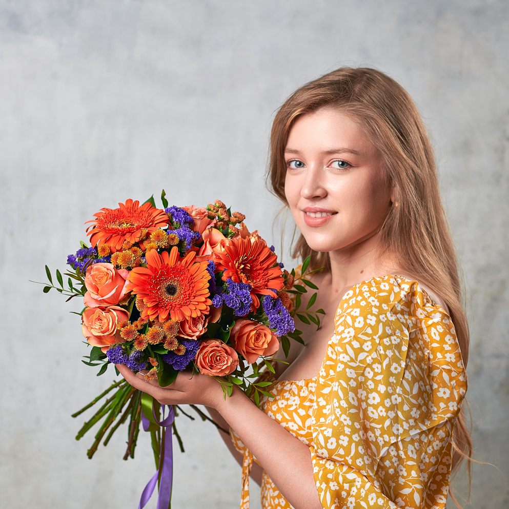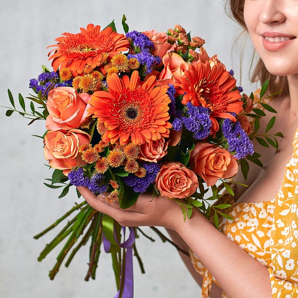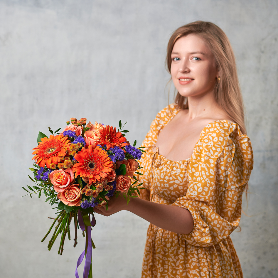 Солнечные цветы любви в теплых оттенках, в сочетании с полевой статицей, символизирующей красоту и долголетие, а также нежной розой, подарят незабываемые эмоции получательнице.Возможны небольшие изменения элементов. Общий вид и композиция букета будет сохранена.