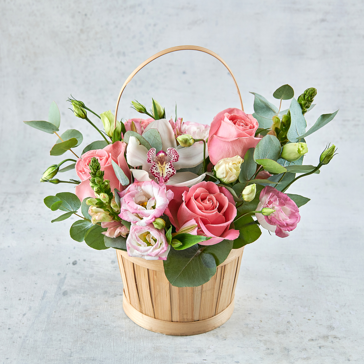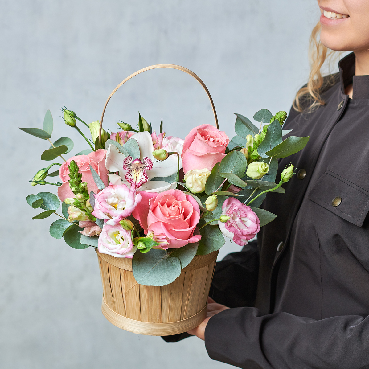 Клубника со сливками, - именно так можно сказать об этой композиции. Экзотические цветы, пышные розы и душистая зелень. Идеальный подарок для любого торжества. Возможны небольшие изменения элементов. Общий вид и композиция букета будет сохранена.