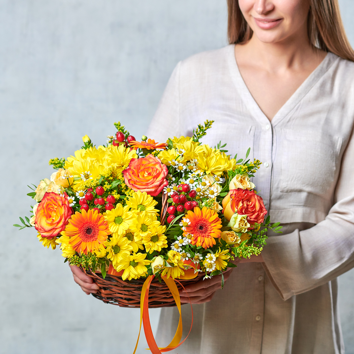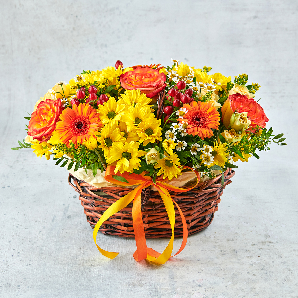 Шепот осеннего леса, теплые лучи солнца и яркий смех. Такая композиция согреет теплом лучезарных африканских ромашек, переливающимися хризантемами и гроздьями блестящего гиперикума. Возможны небольшие изменения элементов. Общий вид и композиция букета будет сохранена.