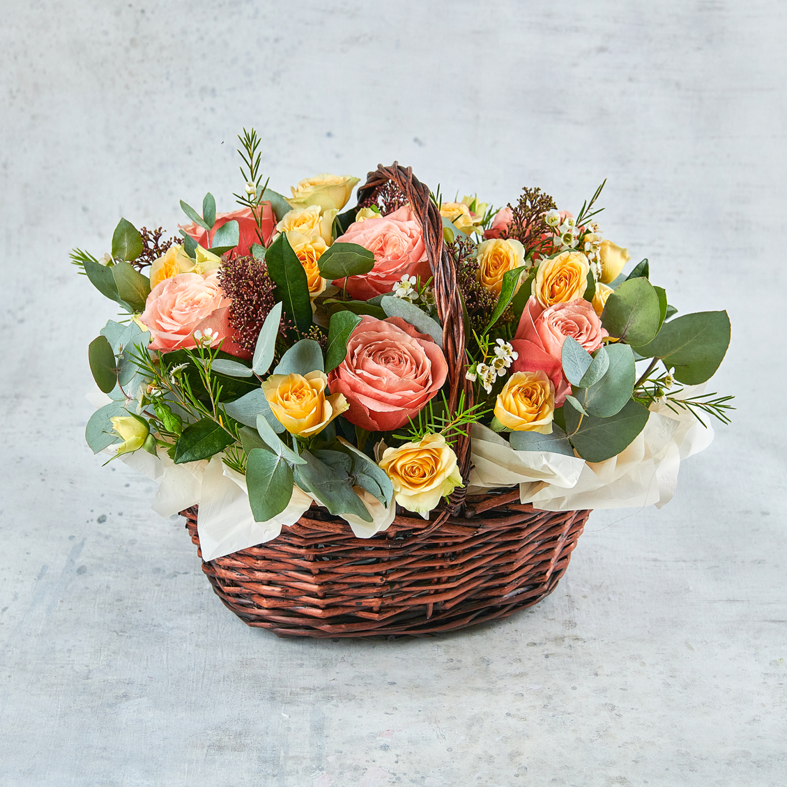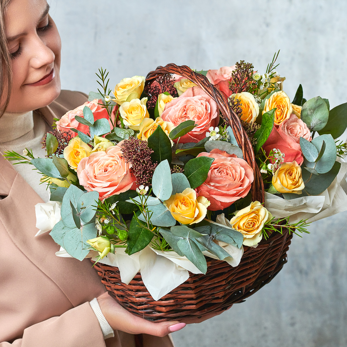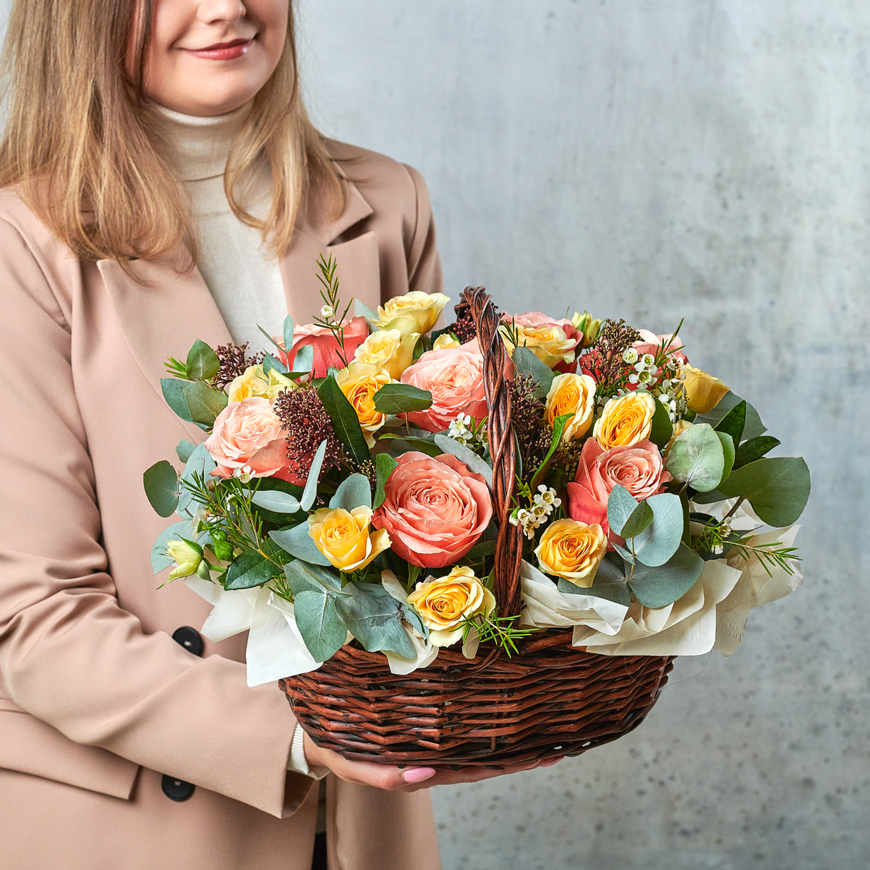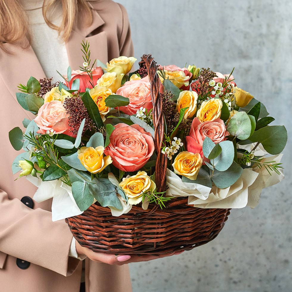 Персики в цвету, это когда каждая деталь пышет свежестью, а мягкая теплая цветовая гамма контрастирует с ледяным ароматным эвкалиптом. Классика для любого праздника. Возможны небольшие изменения элементов. Общий вид и композиция букета будет сохранена.