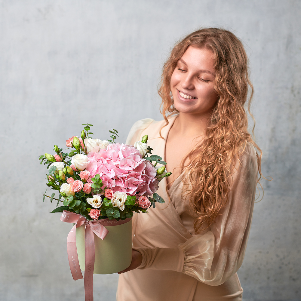 Цветущий сад. Гортензия - любовь всех девушек. Эти чудесные цветочные облака станут безупречным подарком для всех мечтательниц. Возможны небольшие изменения элементов. Общий вид и композиция букета будет сохранена. В составе присутствует сезонный цветок, который может быть заменен, исходя из наличия товара.