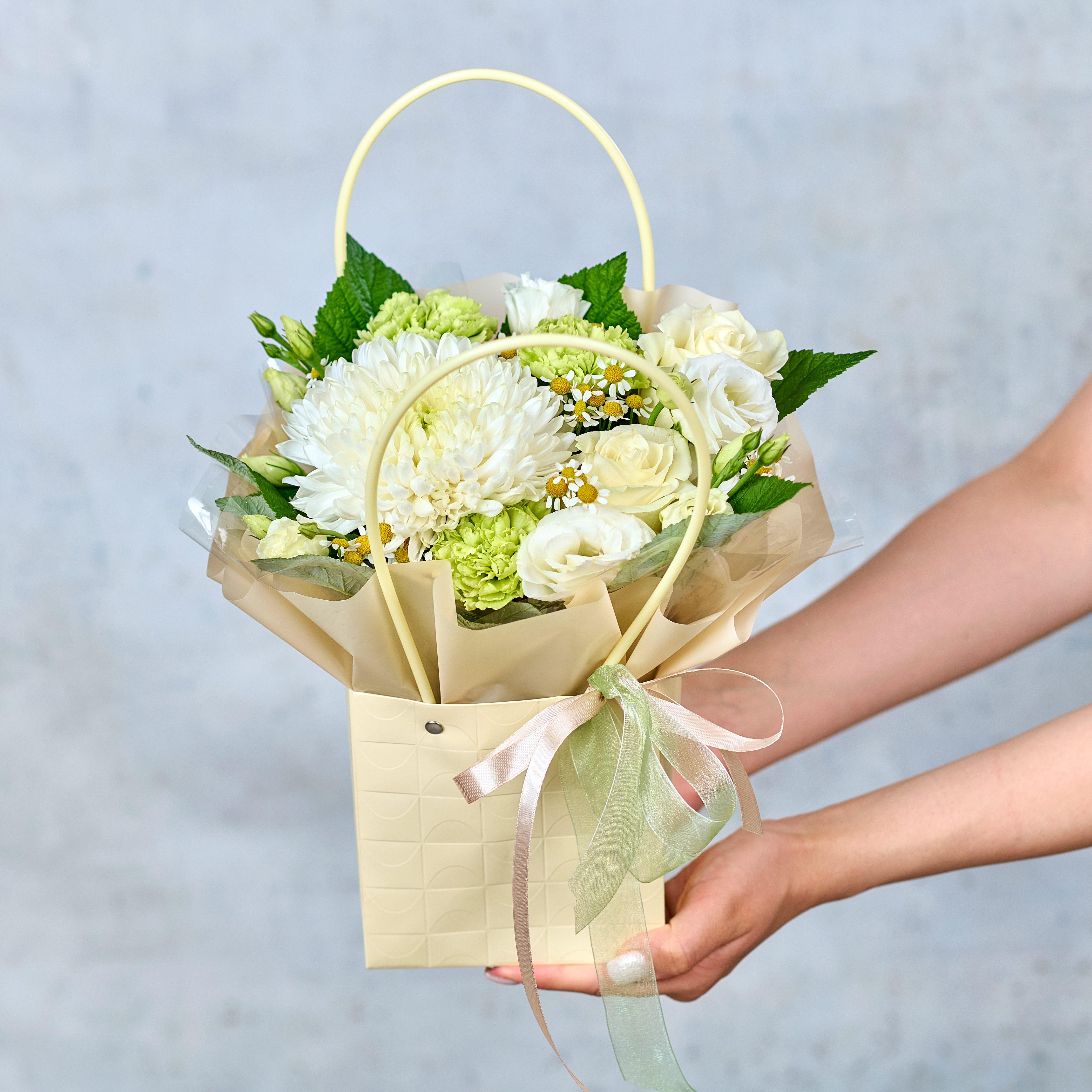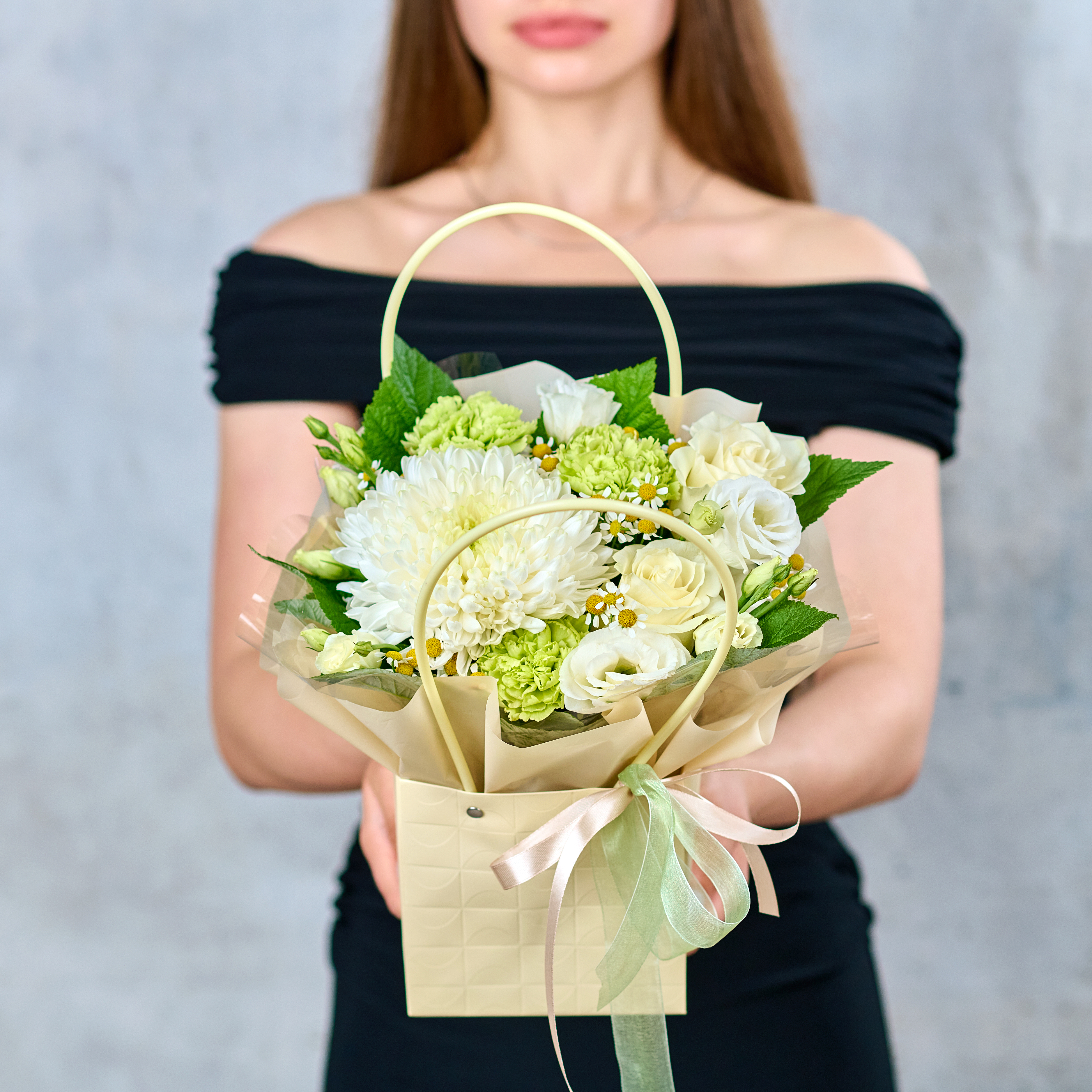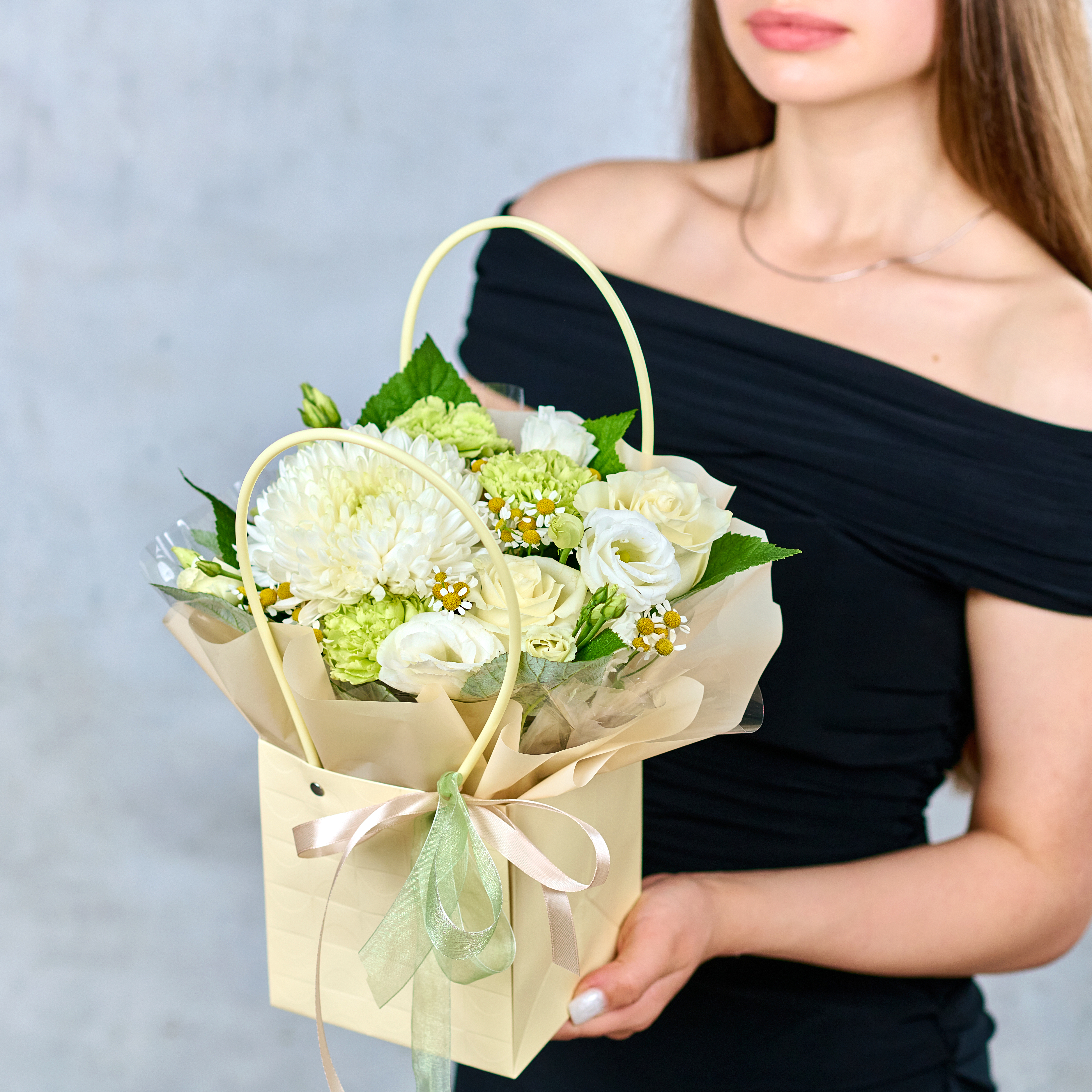 Яркая композиция из эустом и роз, которая станет украшением вашего праздника. Возможны небольшие изменения элементов. Общий вид и композиция букета будет сохранена.