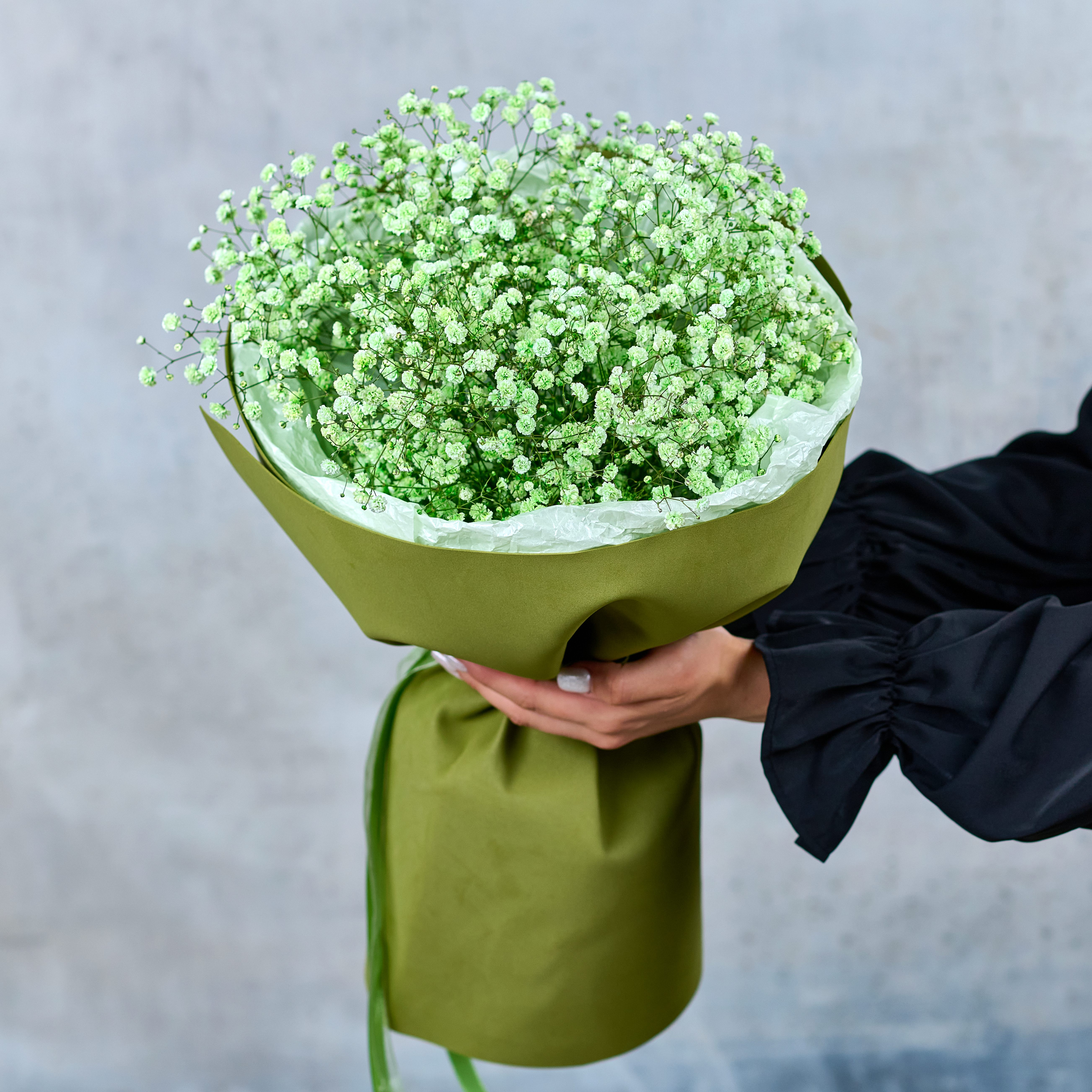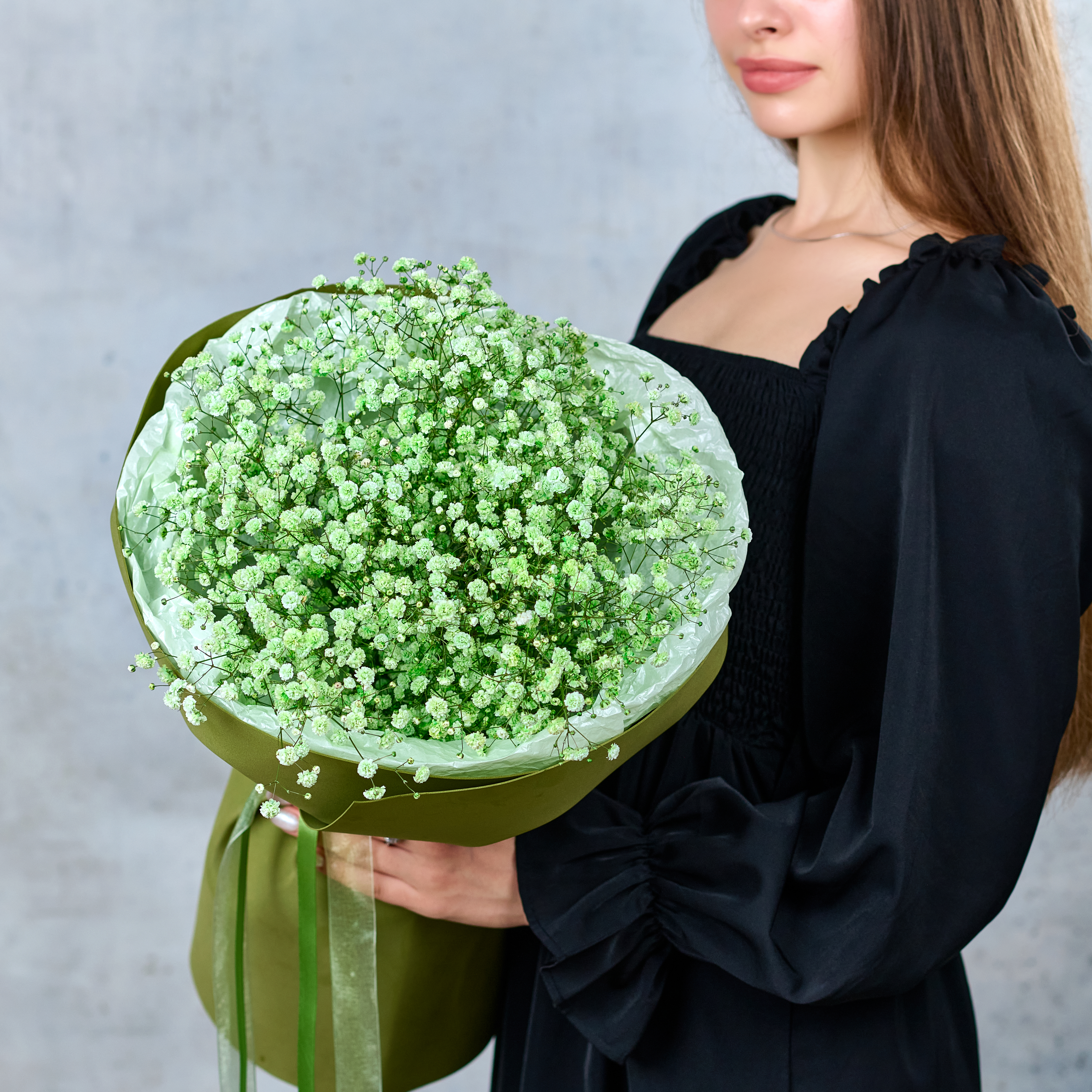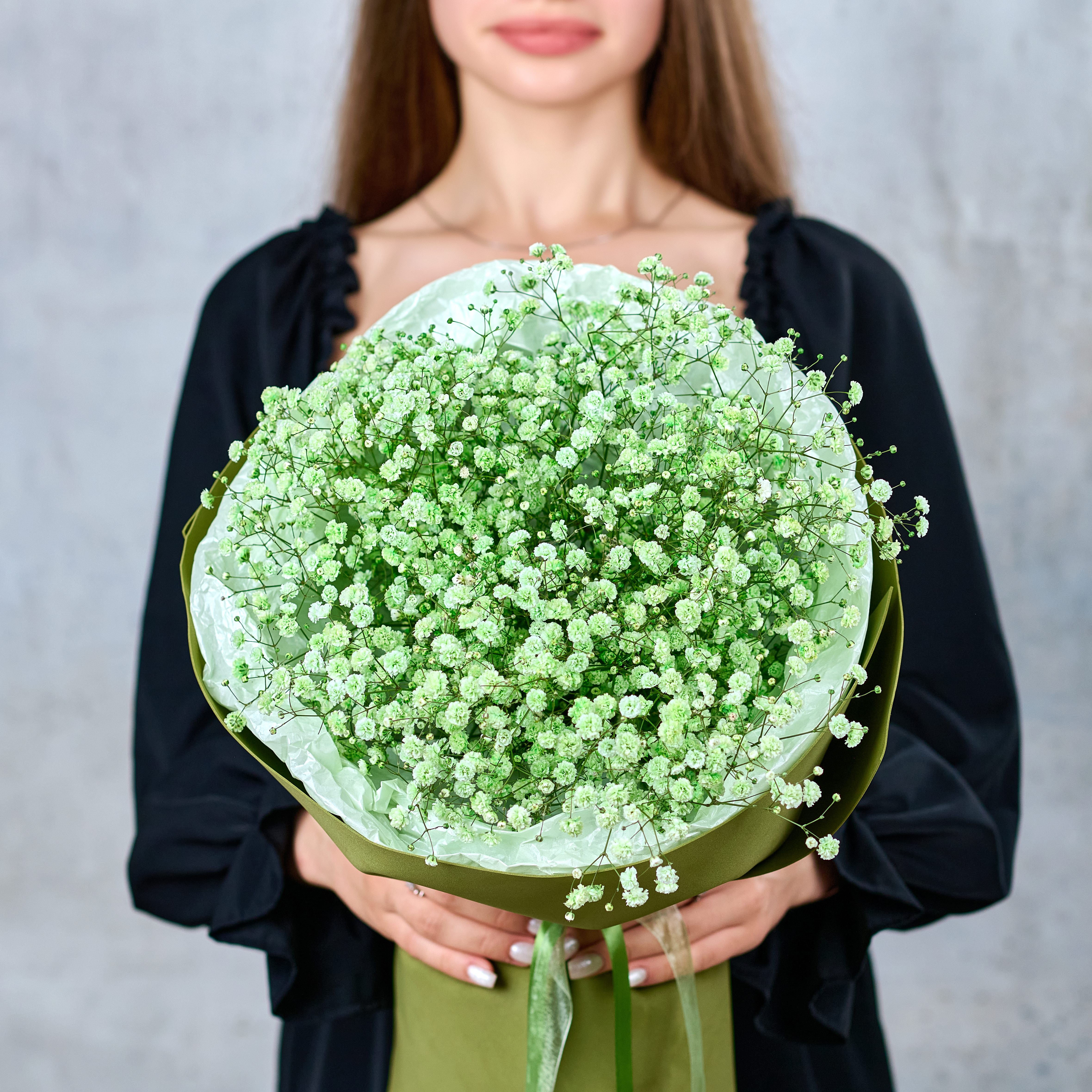 Аккуратный монобукет из зеленой гипсофилы, подчеркнет настроение праздника. Возможны небольшие изменения элементов. Общий вид и композиция букета будет сохранена.