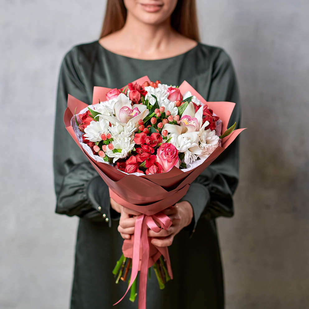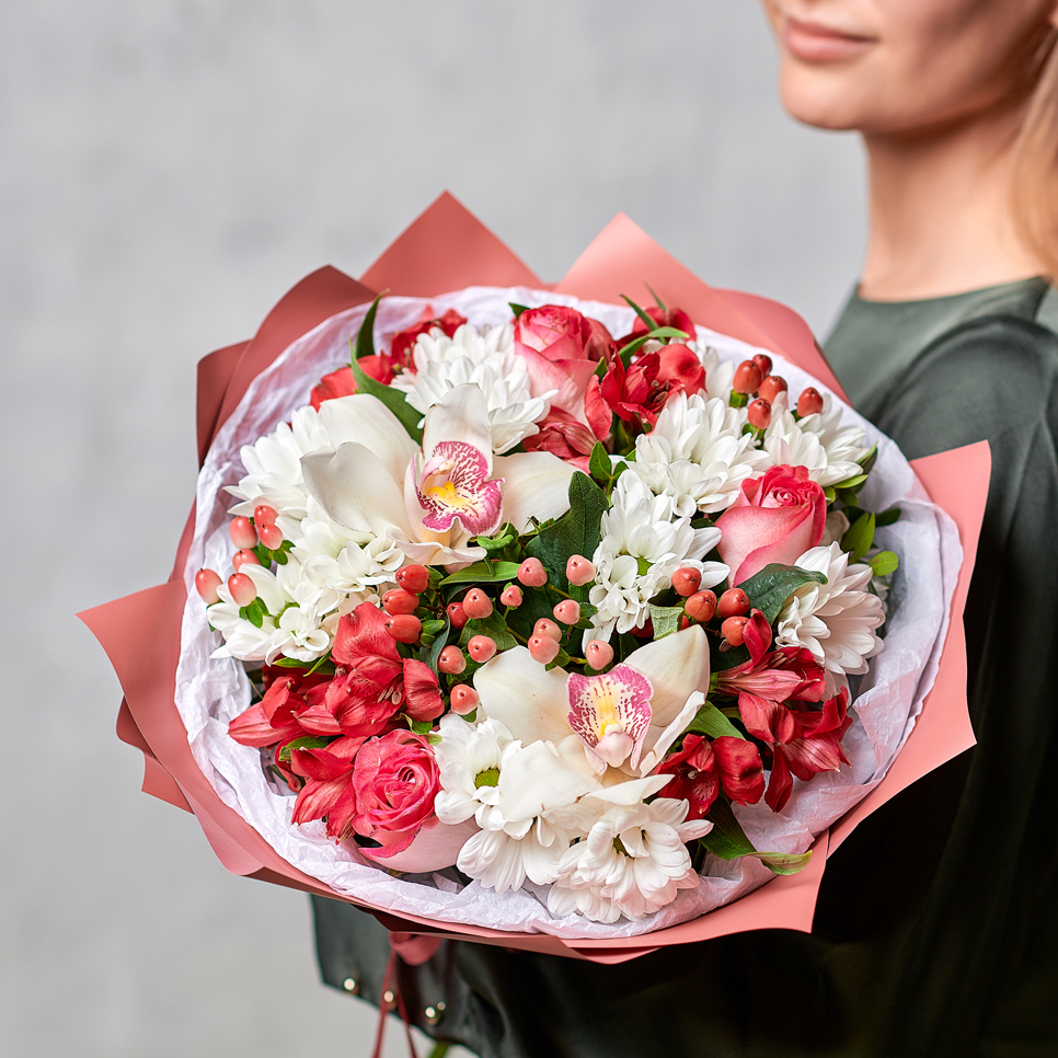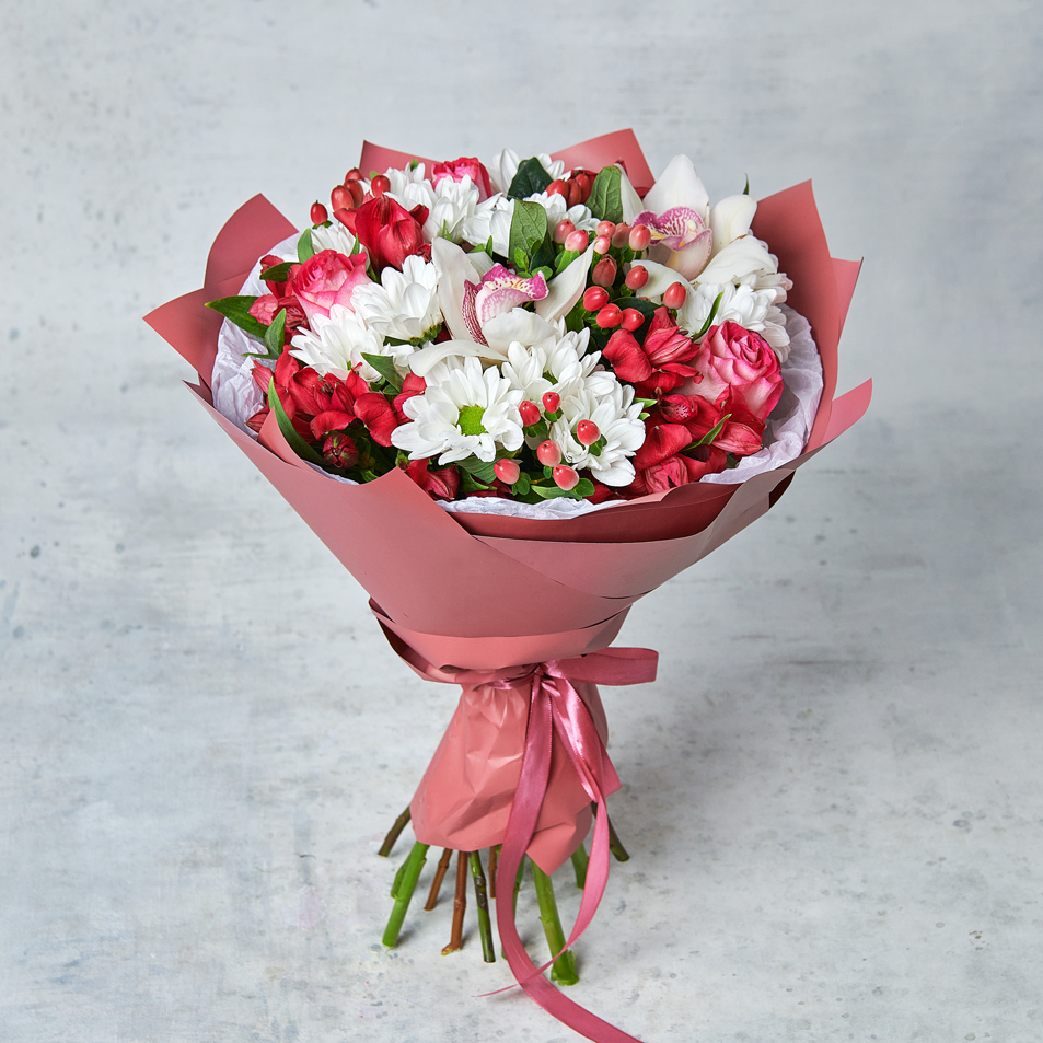 Торжественный и грациозный букет в классическом стиле - подарок, который восхитит сочетаниями и экзотическим набором. Тропические орхидеи, сочный гиперикум - идеальный вариант для тех, кто любит удивлять. Возможны небольшие изменения элементов. Общий вид и композиция букета будет сохранена.