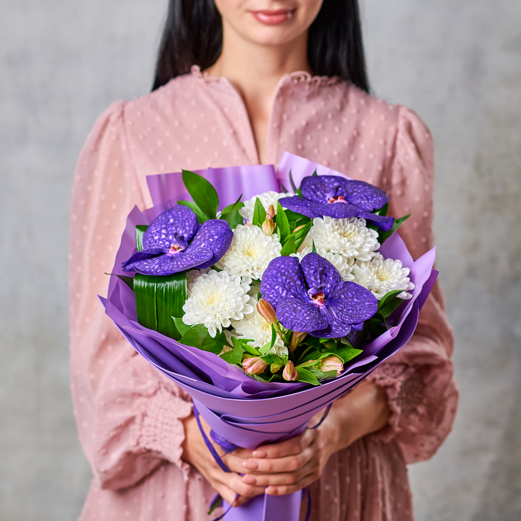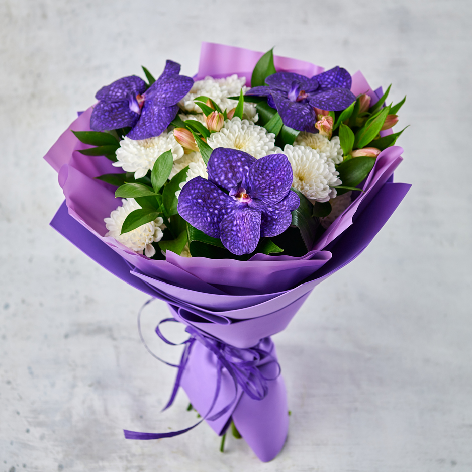 Чарующий оттенок орхидеи "Ванды" оттененный снежной хризантемой и перуанской лилией в классическом исполнении. Для тех, кто любит удивлять. Возможны небольшие изменения элементов. Общий вид и композиция букета будет сохранена.