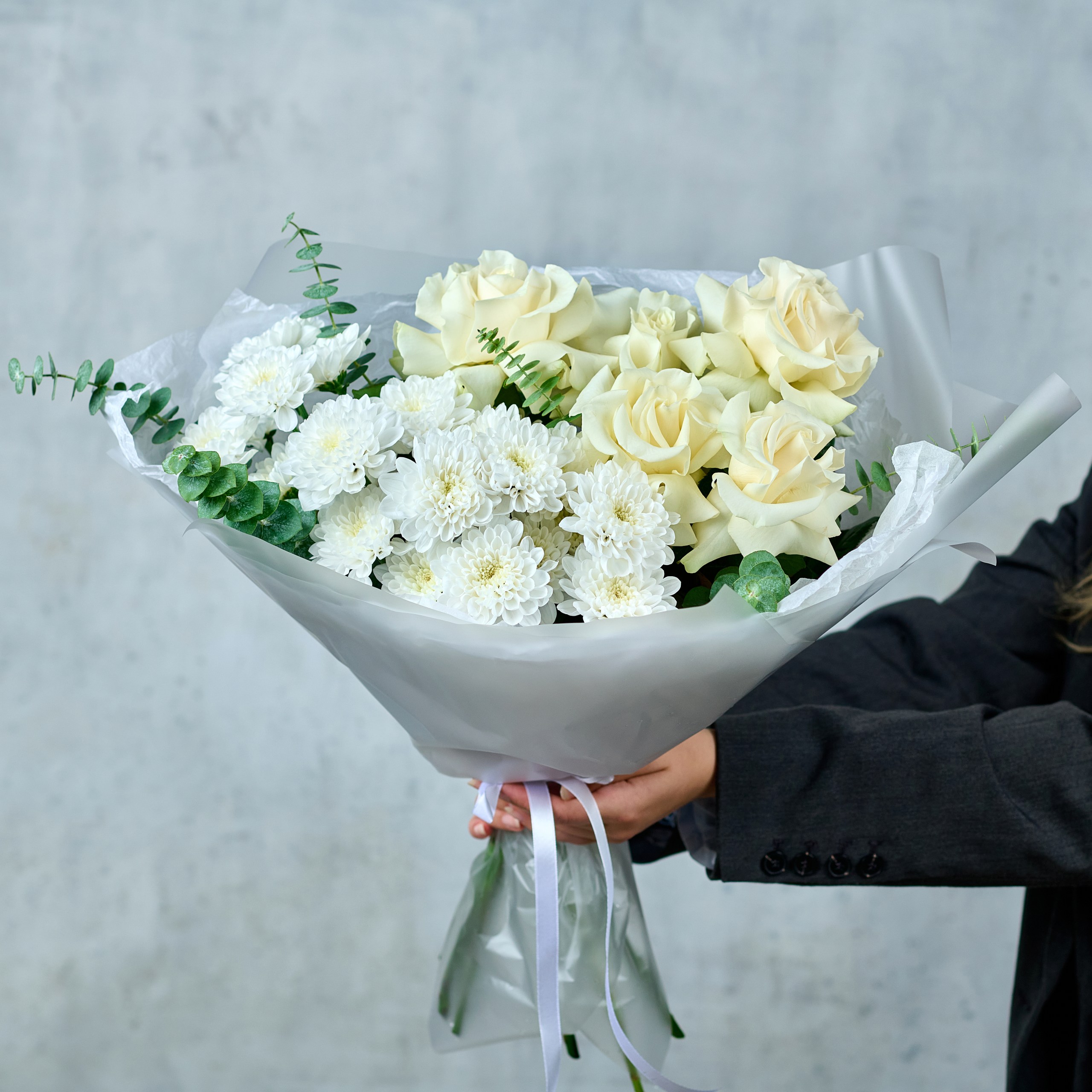 Букет из хризантем и белых французских роз