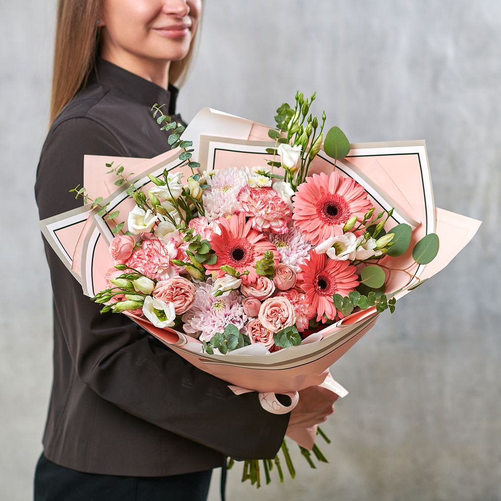 Симфония розового цвета, мечтательный и незабываемый букет станет отличным подарком для ваших любимых. Возможны небольшие изменения элементов. Общий вид и композиция букета будет сохранена.