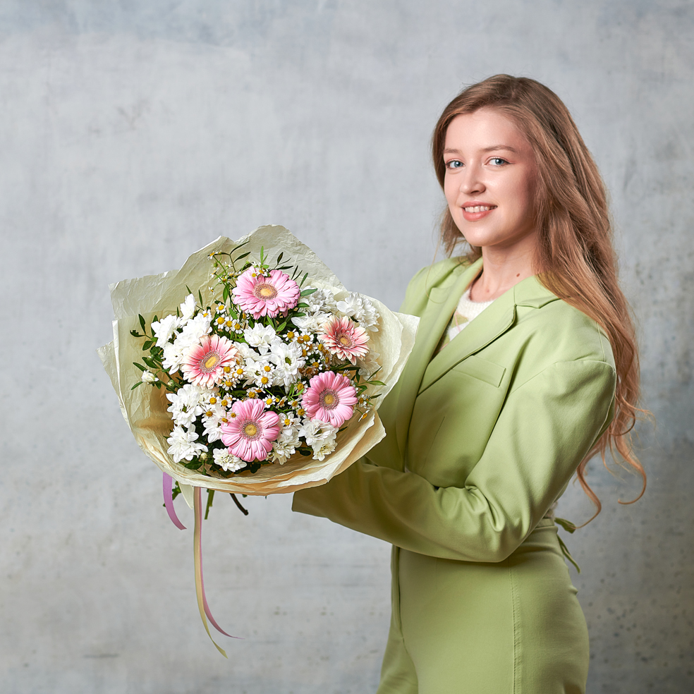 Подарите трогательную летнюю историю из букета ромашек всех видов. Такой букет точно оставит впечатление на долгое время. Возможны небольшие изменения элементов. Общий вид и композиция букета будет сохранена.