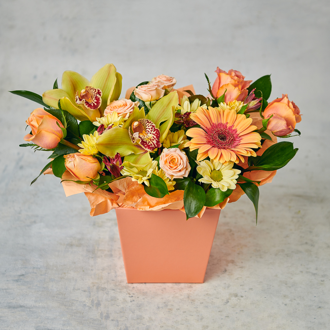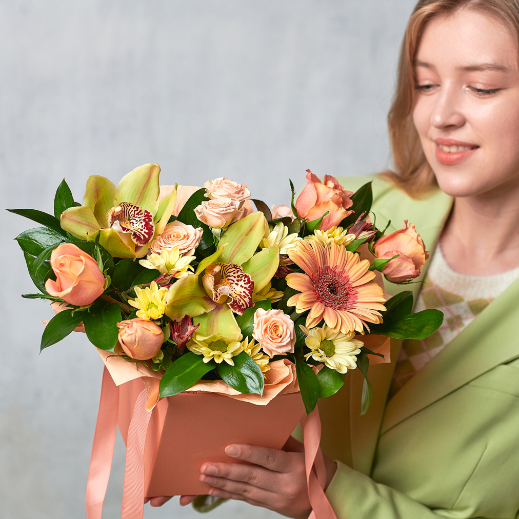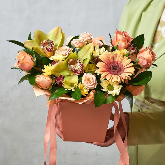 Экзотические орхидеи, африканская ромашка, подчеркнутая розовыми кустами в раскидистой форме уже шепчет о совершенстве линий и красоте, слышите? Возможны небольшие изменения элементов. Общий вид и композиция букета будет сохранена.