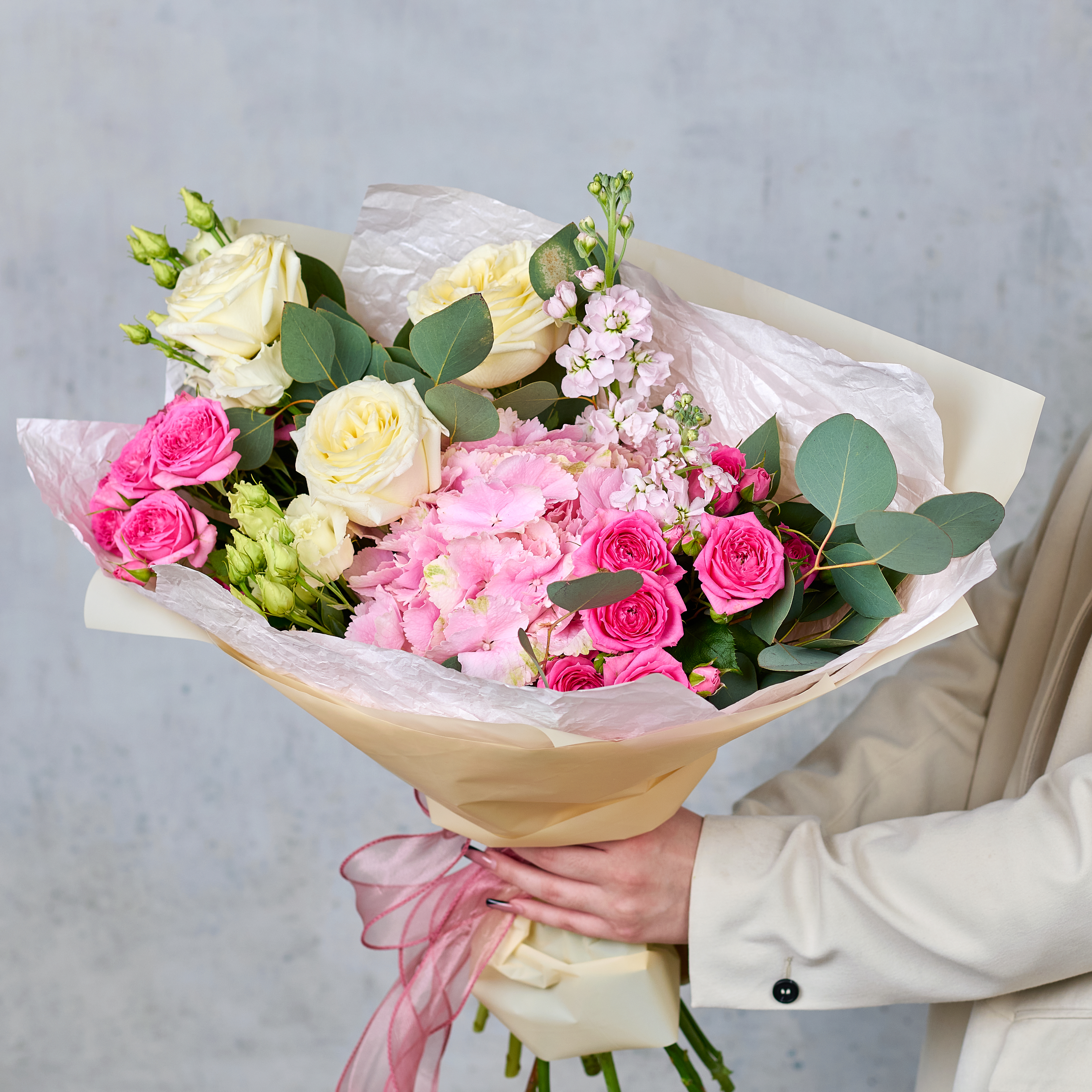 Собрали в один букет все, что так любит прекрасный пол. Воздушная гортензия, роскошные розы и ароматный эвкалипт, идеальный способ поднять настроение и окружить себя восхищенными взглядами. Обратите внимание, что гортензия - сезонный цветок, при необходимости менеджер может предложить замену, исходя из наличия товара.