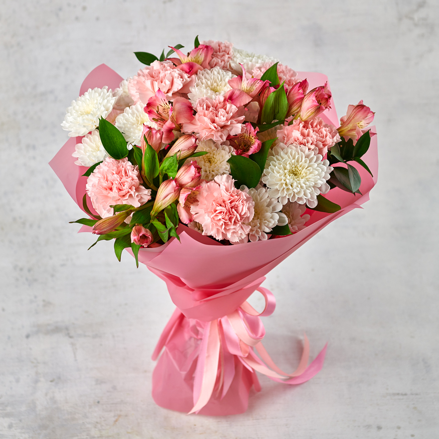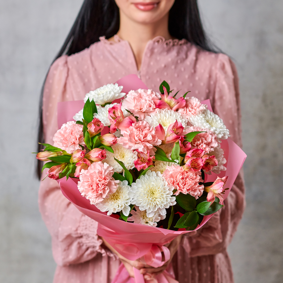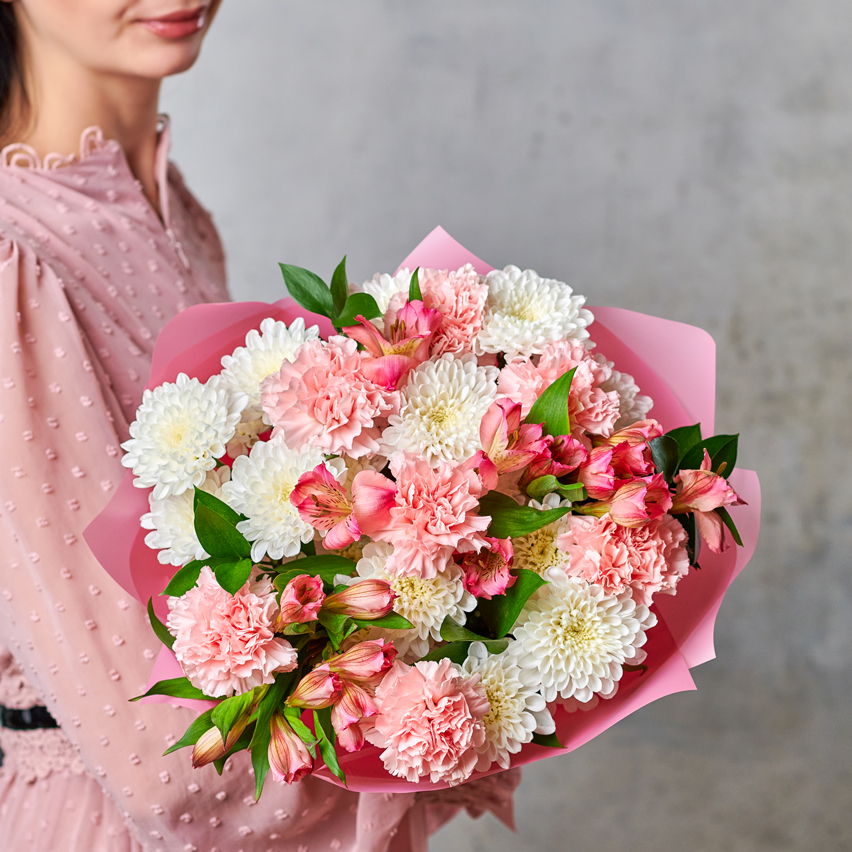 Сборный букет из самых стойких цветов - очевидный выбор для любого повода. В составе присутствуют хризантемы, диантусы и перуанские лилии. Букет выполнен в классическом стиле и самой востребованной цветовой гамме. Возможны небольшие изменения элементов. Общий вид и композиция букета будет сохранена.