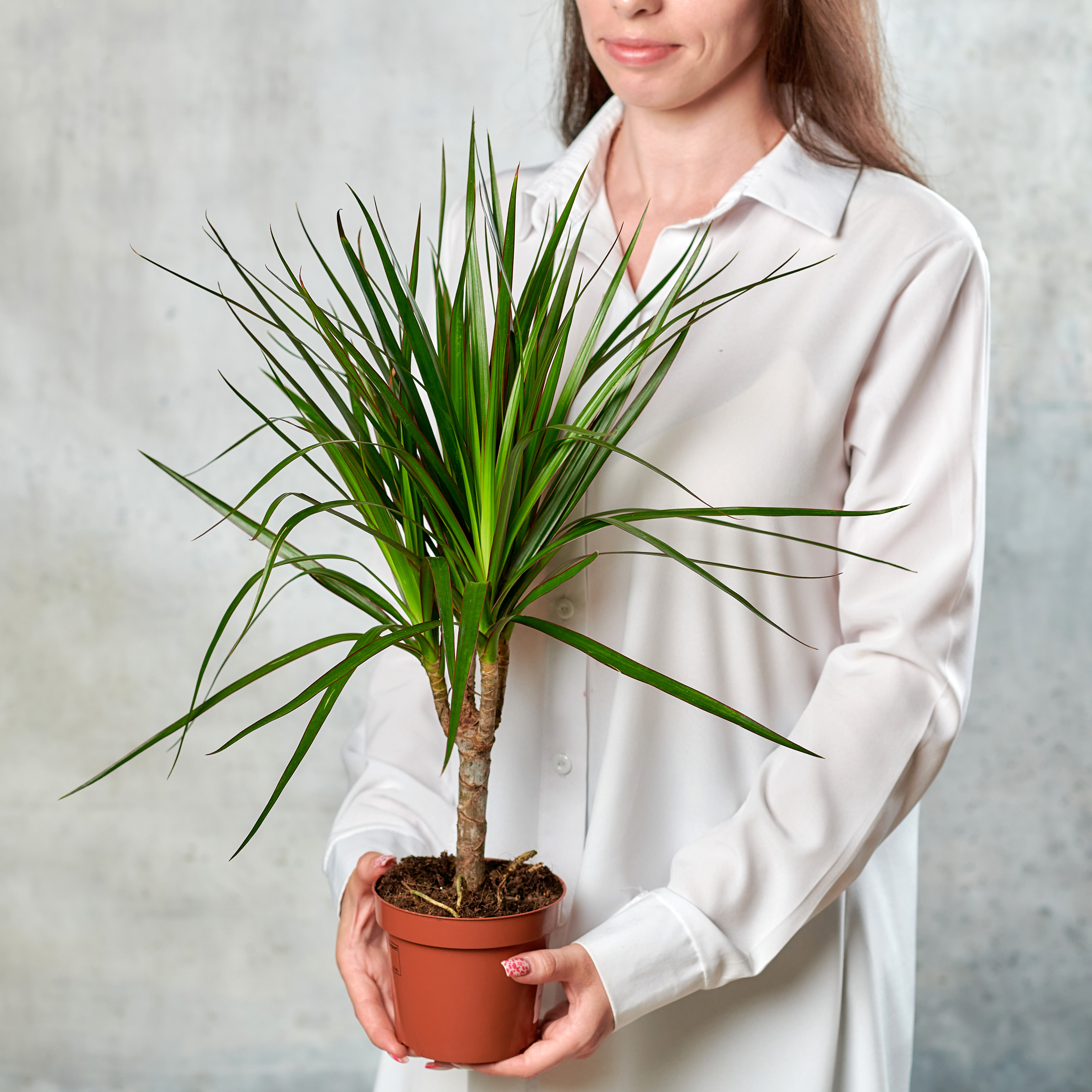 Драцена - популярное комнатное растение, в переводе название означает "самка дракона", традиционно считается, что дерево драцены приносит счастье, любовь и благополучие, отдельные виды даже переводятся как "счастливый бамбук". Драцена имеет оголенный древесный стебель и вытянутые темно-зеленые перовидные листья. Цветок станет прекрасным украшением интерьера и добавит уюта дому. Драцены очень просты в уходе, выбирайте притемненное место, вдали от прямых солнечных лучей, для некоторых видов подойдет рассеянный свет. Как и со всеми растениями, лучше избегать батарей, плит и отопительных приборов рядом с кашпо, избегайте перепада температур. Листья драцены стоит протирать влажной тряпкой, очищая от пыли раз в 1-2 недели. Зимой и летом, при повышении температуры в доме до +25 градусов, можно опрыскивать листья холодной водой. Для корневой системы драцены подойдут высокие, но не широкие горшки. Возможны незначительные изменения элементов. Общий вид и композиция будет сохранена.