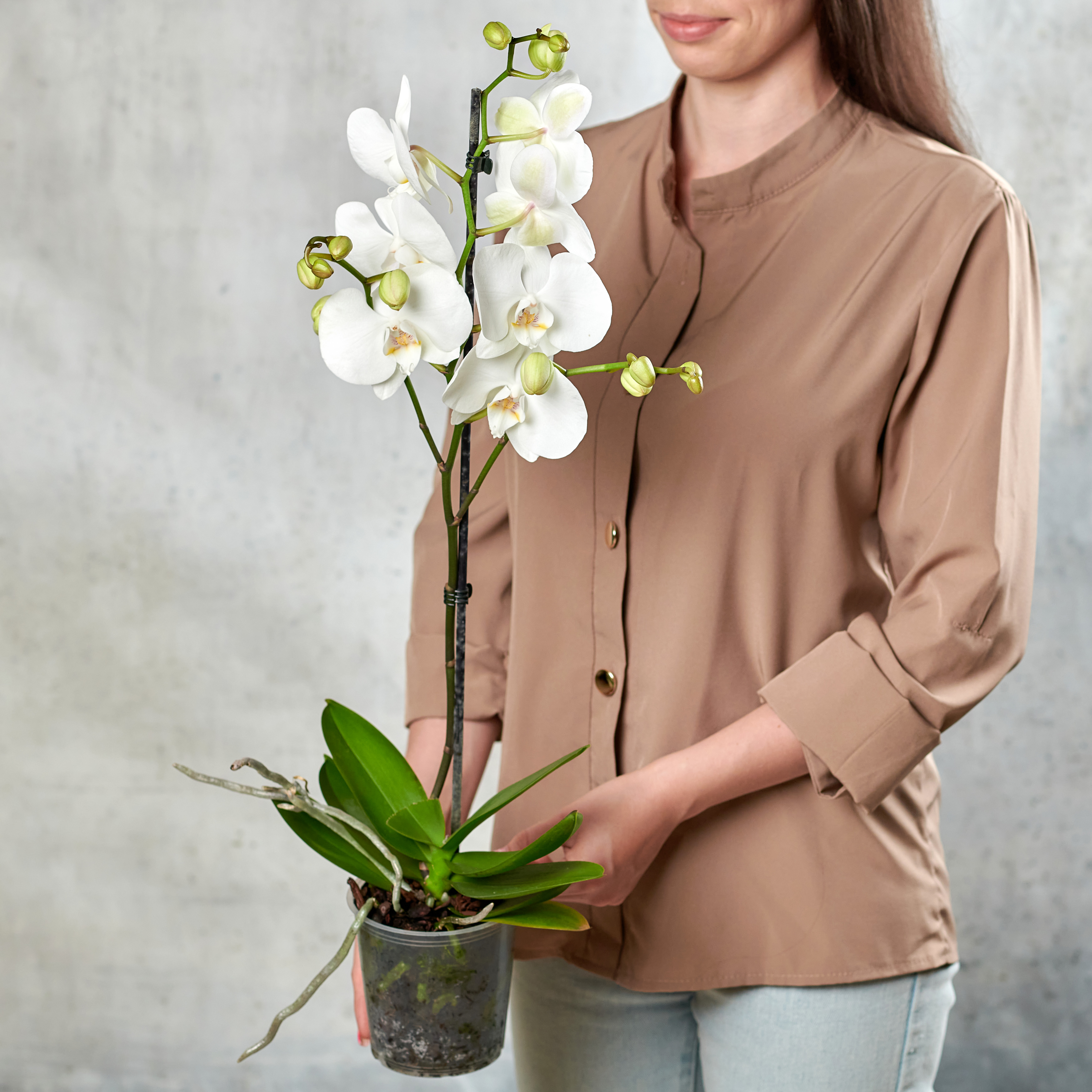 Неприхотливая, экзотичная и безумно красивая Орхидея Фаленопсис. Она питается светом, даже корни участвуют в фотосинтезе, именно поэтому ей очень нравится быть в прозрачном кашпо, берите на заметку! Поливать ее стоит не сверху, а в поддон. Избегайте попадания воды на листья во время полива (можно использовать полив с погружением кашпо в ёмкость с водой). Орхидея Фаленопсис сама расскажет вам, когда потребует полива. Корни зелёные - поливать не надо, если вы заметили, что они светлеют, стоит полить, предварительно проверив влажность внутри кашпо. Возможны небольшие изменения элементов. Общий вид и композиция букета будет сохранена.