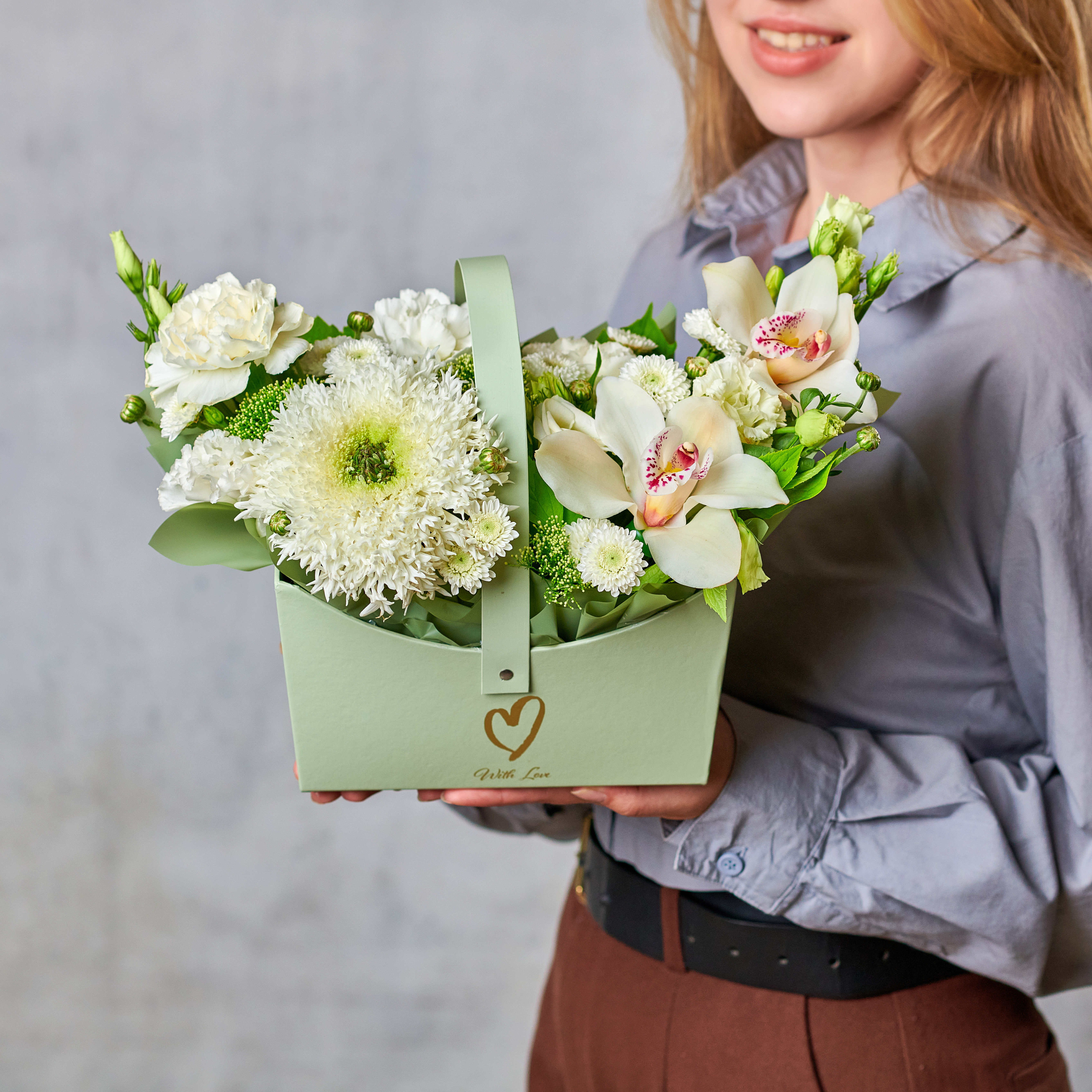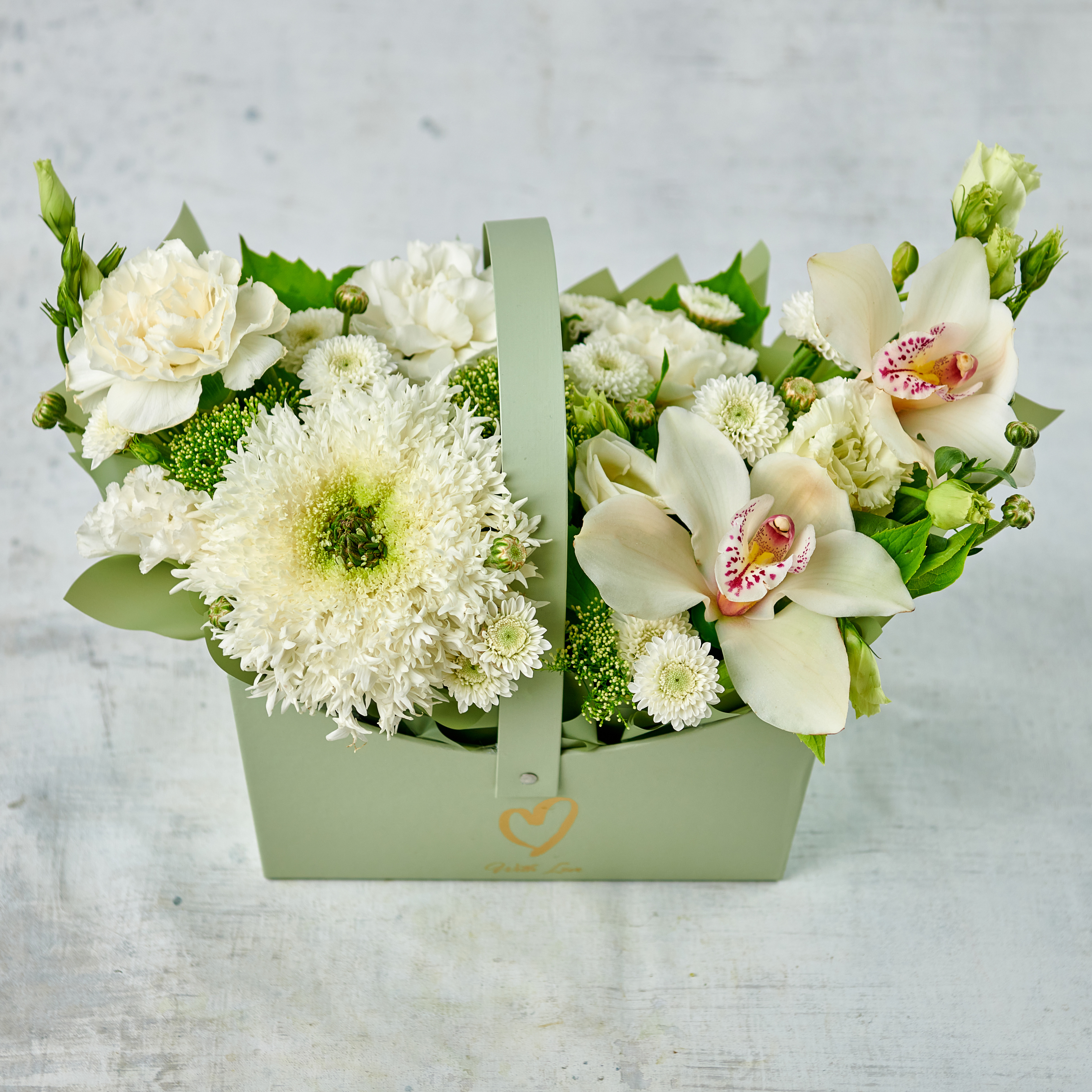 Нежная буря искристых цветов - подарок, который останется в памяти, рисуя улыбку на лице каждый день. Идеальная цветовая гамма, многообразие фактур и форм, экзотические орхидеи в белоснежном исполнении станут прекрасным подарком для любого повода. Возможны небольшие изменения элементов. Общий вид и композиция букета будет сохранена.