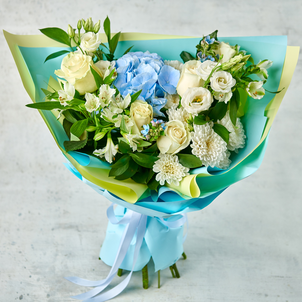 Пушистое голубое облако, нежные незабудки и воздушная упаковка в современной форме. Такой состав придется по вкусу даже самым прихотливым натурам. В составе присутствует сезонный цветок, который может быть изменен в соответствии с наличием товара. Возможны небольшие изменения элементов. Общий вид и композиция букета будет сохранена.