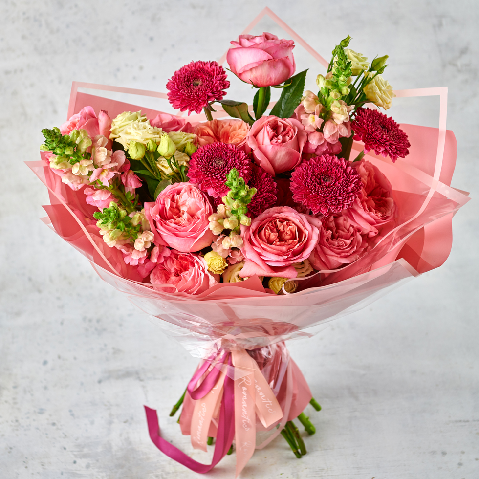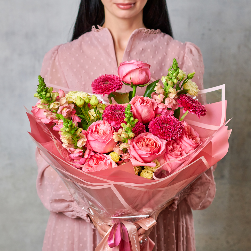 Розовый взрыв из ярких чувств. Безупречная палитра для любого повода в современной форме. Возможны небольшие изменения элементов. Общий вид и композиция букета будет сохранена.